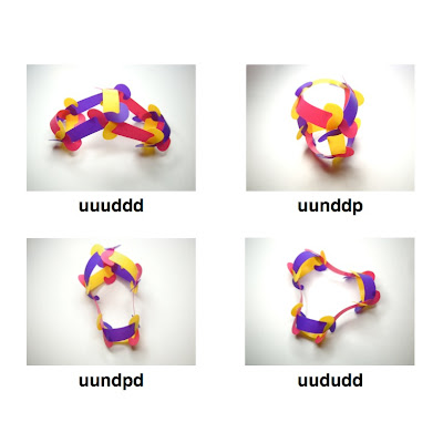 The "Word" mentioned in our title is written in a made-up language called undip. Undip uses a four-letter alphabet {u, n, d, p}. I'm going to skip over what we were actually teaching at our booth—how a weaver can interpret an undip word to make a basket—here I want to talk about the language itself, which is a language describing sculptural shapes. You'll have to trust me that a weaver could read the undip words in these captions and weave the baskets shown above them.